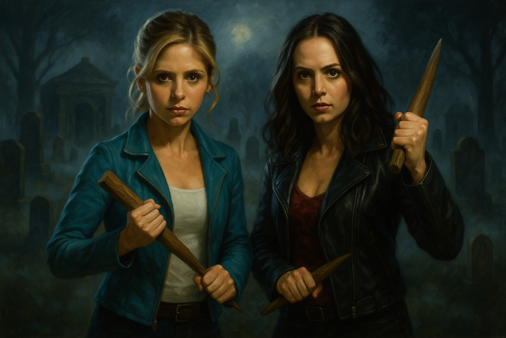 by adminFog wound through the cemetery like ghostly fingers, clinging low to the ground and weaving around gravestones in heavy, pale tendrils. Buffy Summers navigated the labyrinthine paths, her boots crunching softly on the gravel. The fog curled around her ankles like a persistent cat, thick enough that the gravestones seemed to rise from an endless gray sea. Beside her, Faith moved with a predator’s grace, her leather jacket catching the moonlight in sleek ripples. A stake twirled effortlessly between her fingers, the wooden tip flashing in and out of the gloom.
