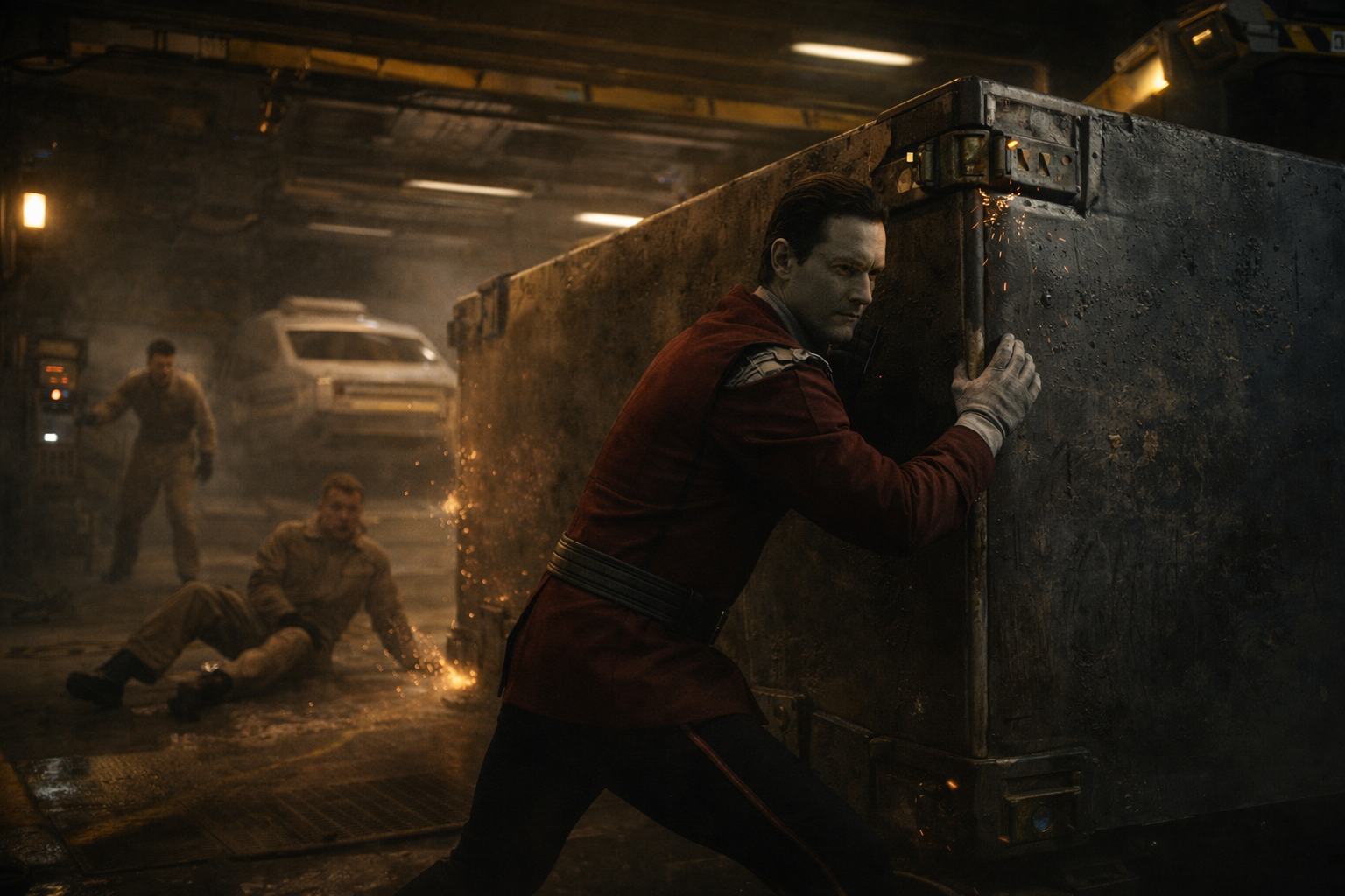 “Crewman Miller,” Data said. His voice was unchanged. No strain. No breath. “Engage the emergency tether on the overhead gantry. The local gravity grid is destabilising. I cannot maintain this angle indefinitely.”